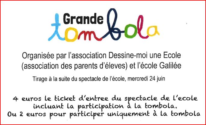 Tombola de fin d’année !Billet publié dans Parents le 26 mai 2015 Share on Facebook Share Share on LinkedIn Share Send email Mail Print Print